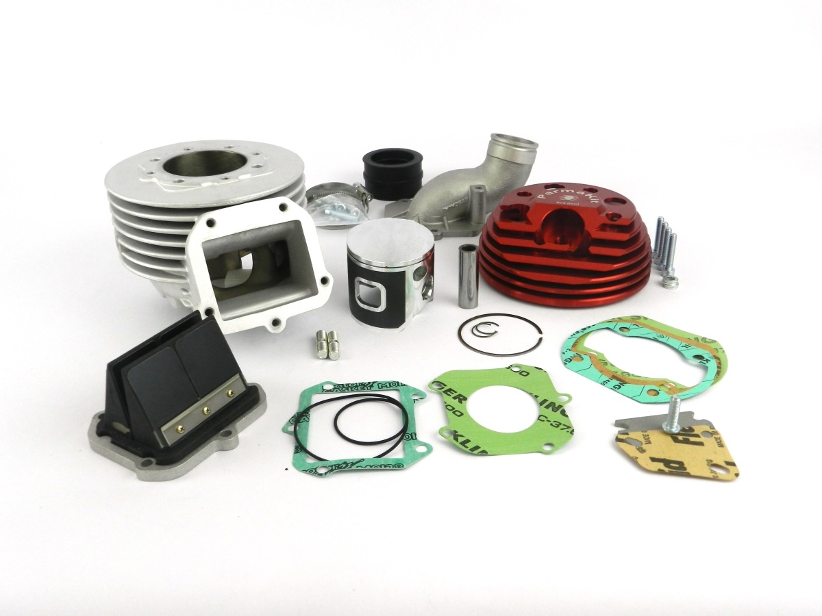 ‘- Cilindro in alluminio d.58 con canna al nikasil – Corsa 51 x biella 97mm – Pistone forgiato mono segmento in acciaio – Testa integrale con foro candela laterale – Collettore aspirazione d.37 – Valvola lamellare a 8 petali con guidaflusso